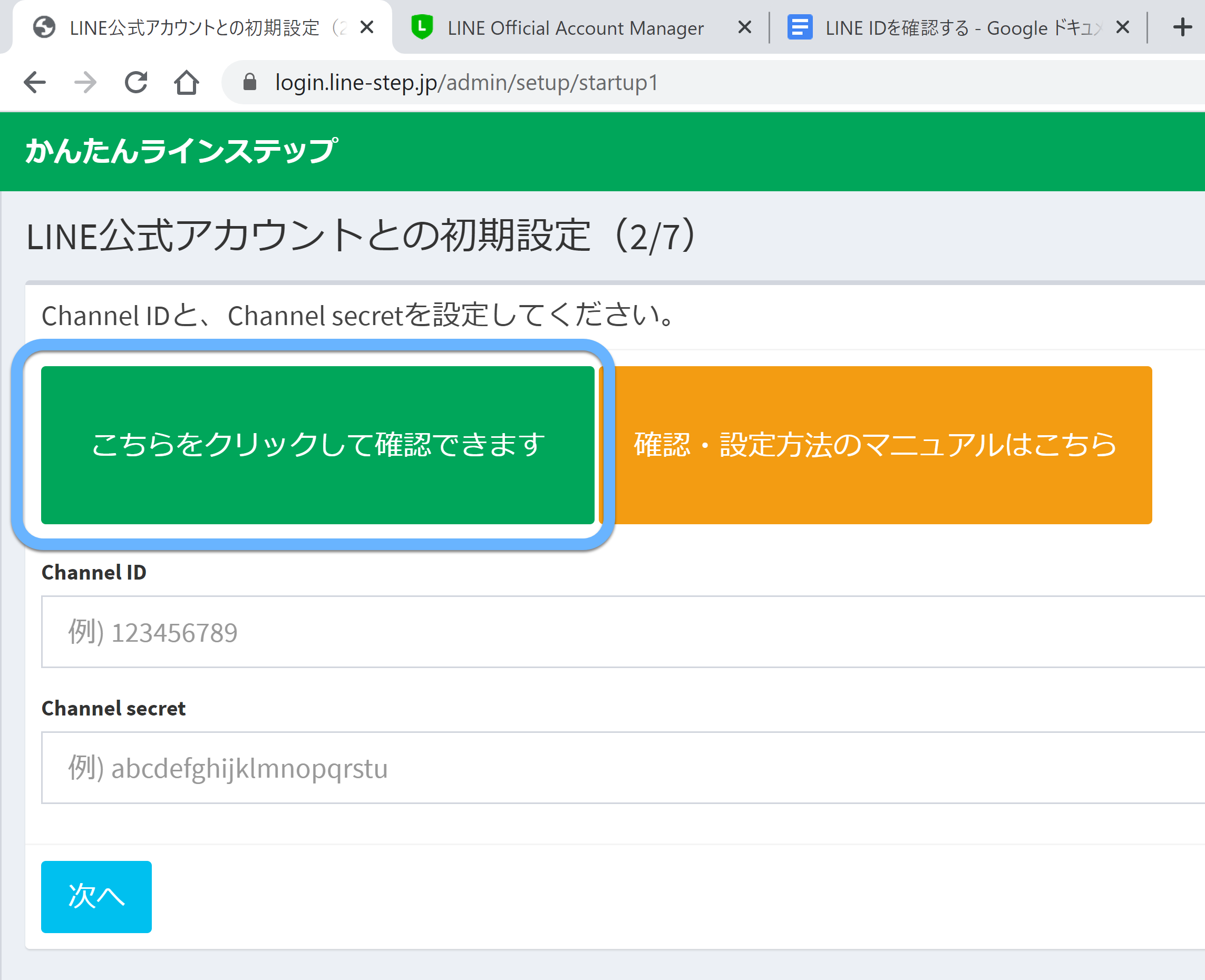 かんたんラインステップの管理画面で、水色の「次へ」ボタンを押します。