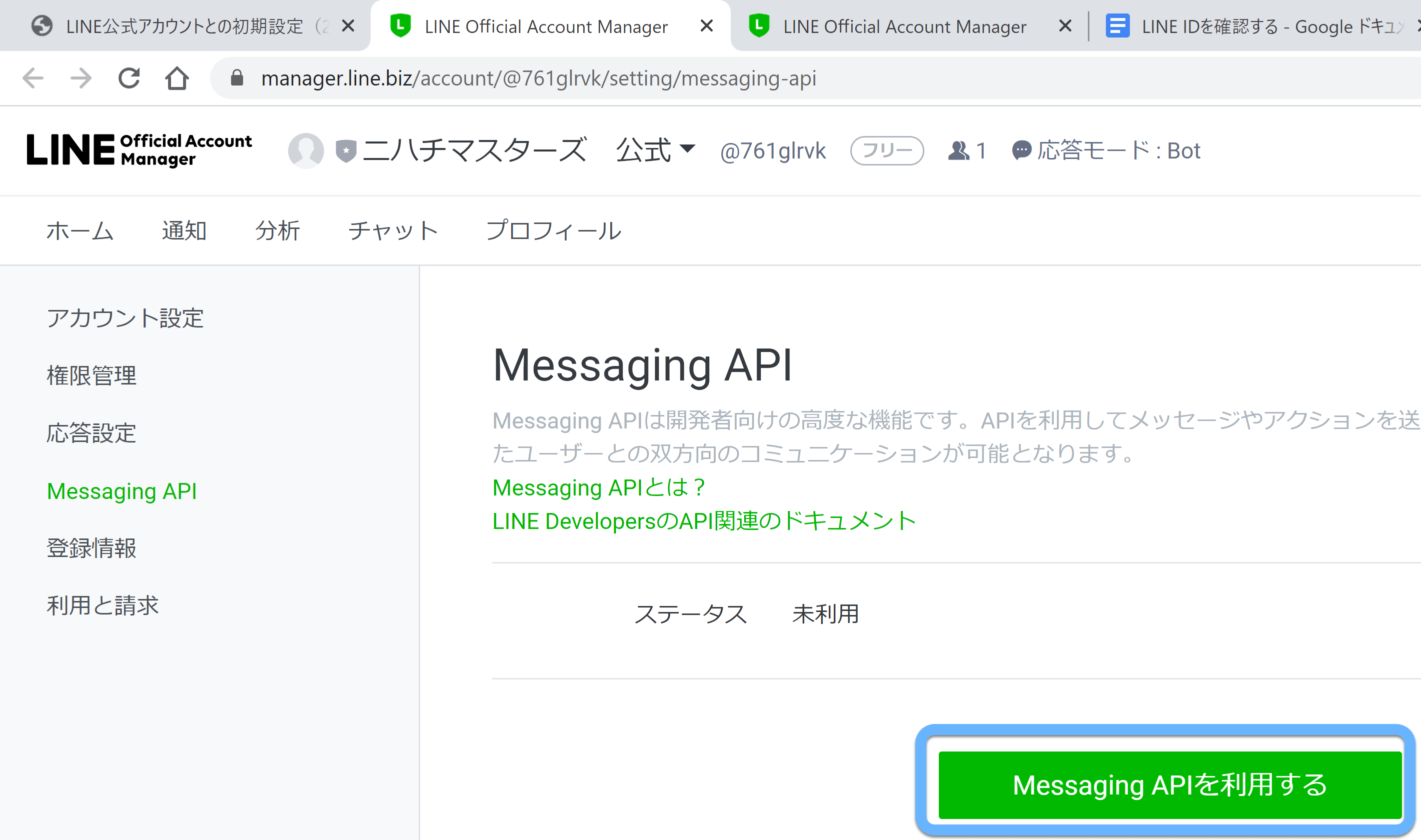 まずは、「Messaging APIを利用する」ボタンを押してください。