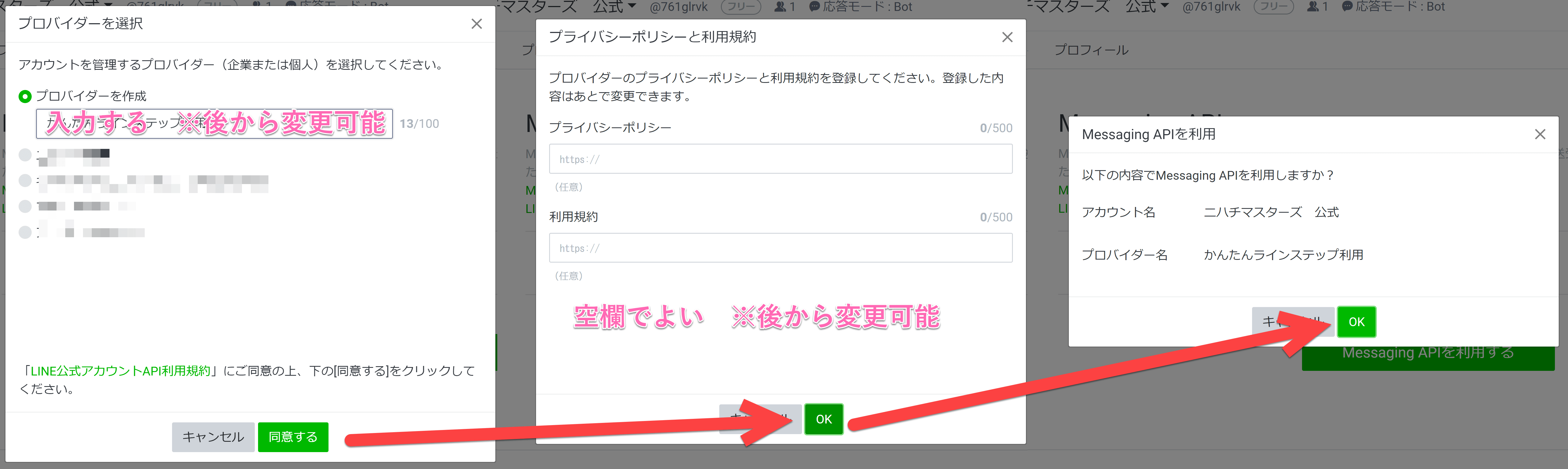 ちなみに、ひとつのLINE公式アカウントにつき、ひとつのプロバイダー設定をしておいたほうが、あとあと、困らないと思います。
