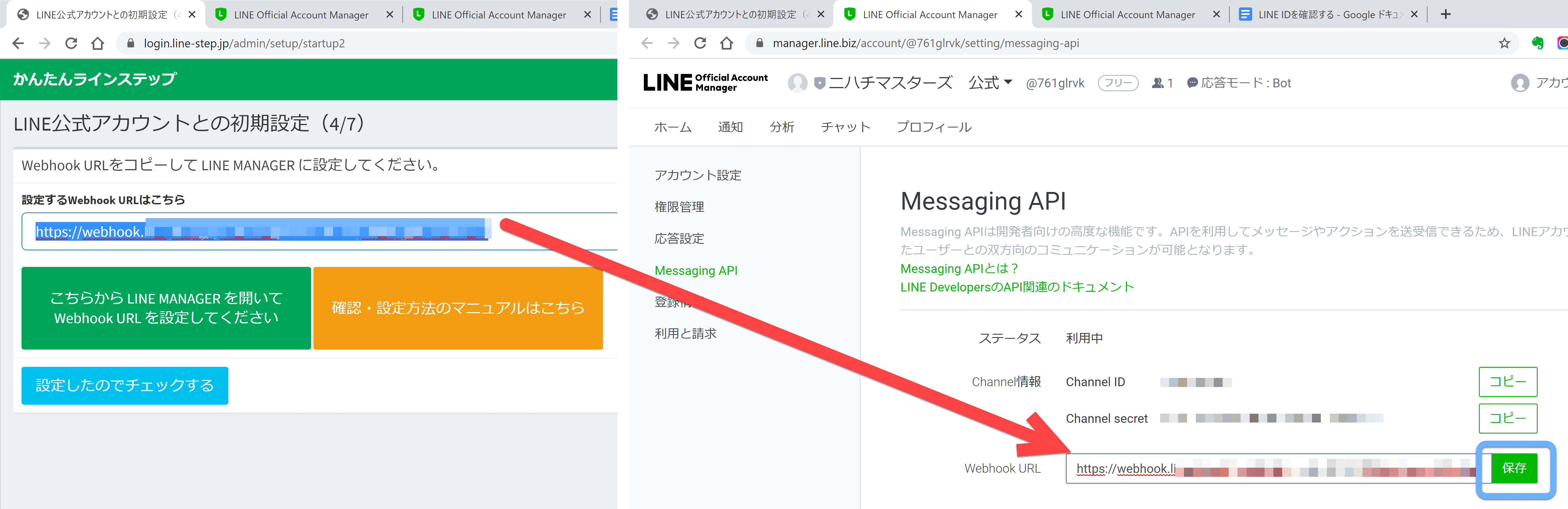 ③Messaging APIの「Webhook URL」 ※保存できてますか?