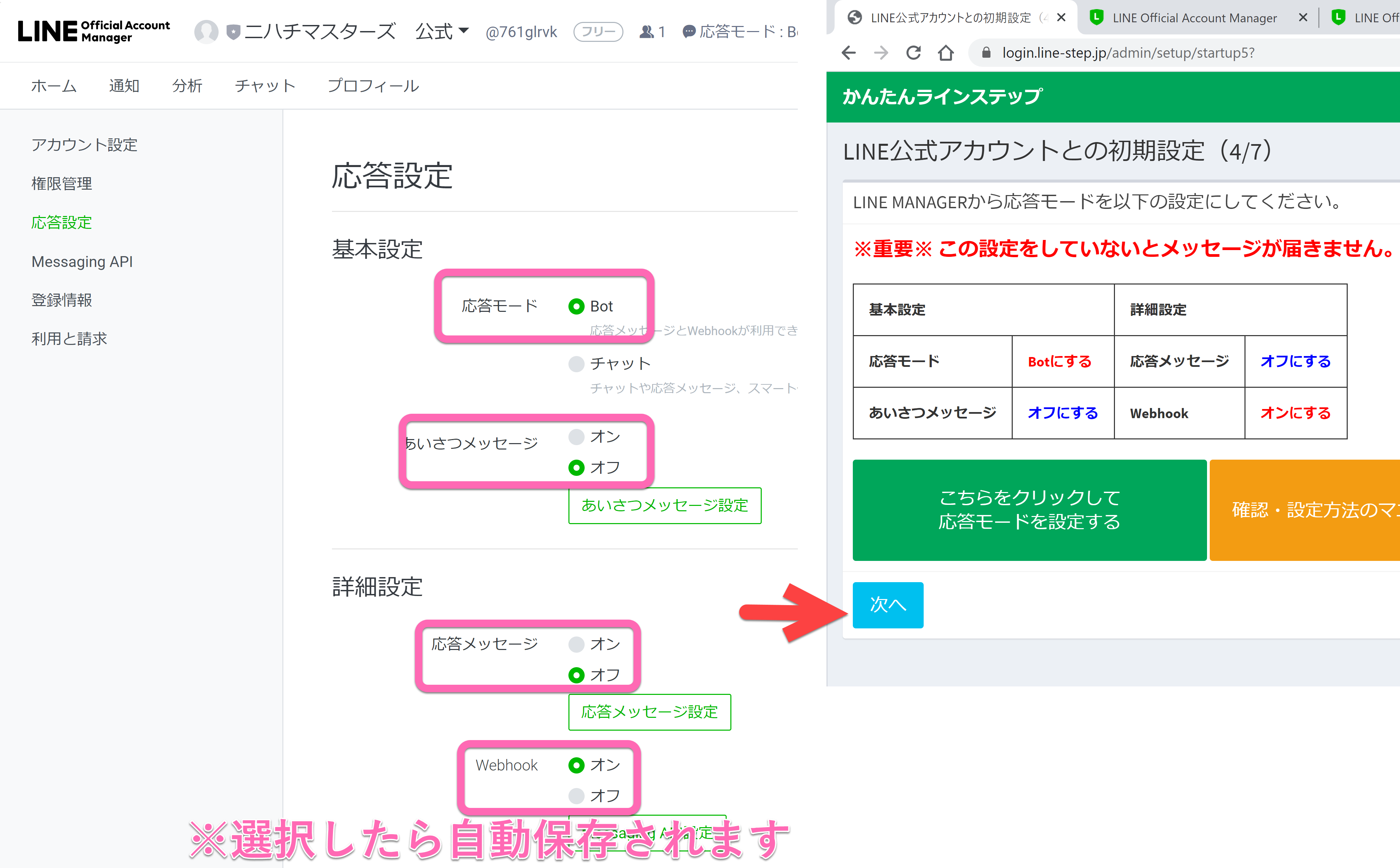 LINE公式アカウントと、かんたんラインステップとの連携作業をしましょう。