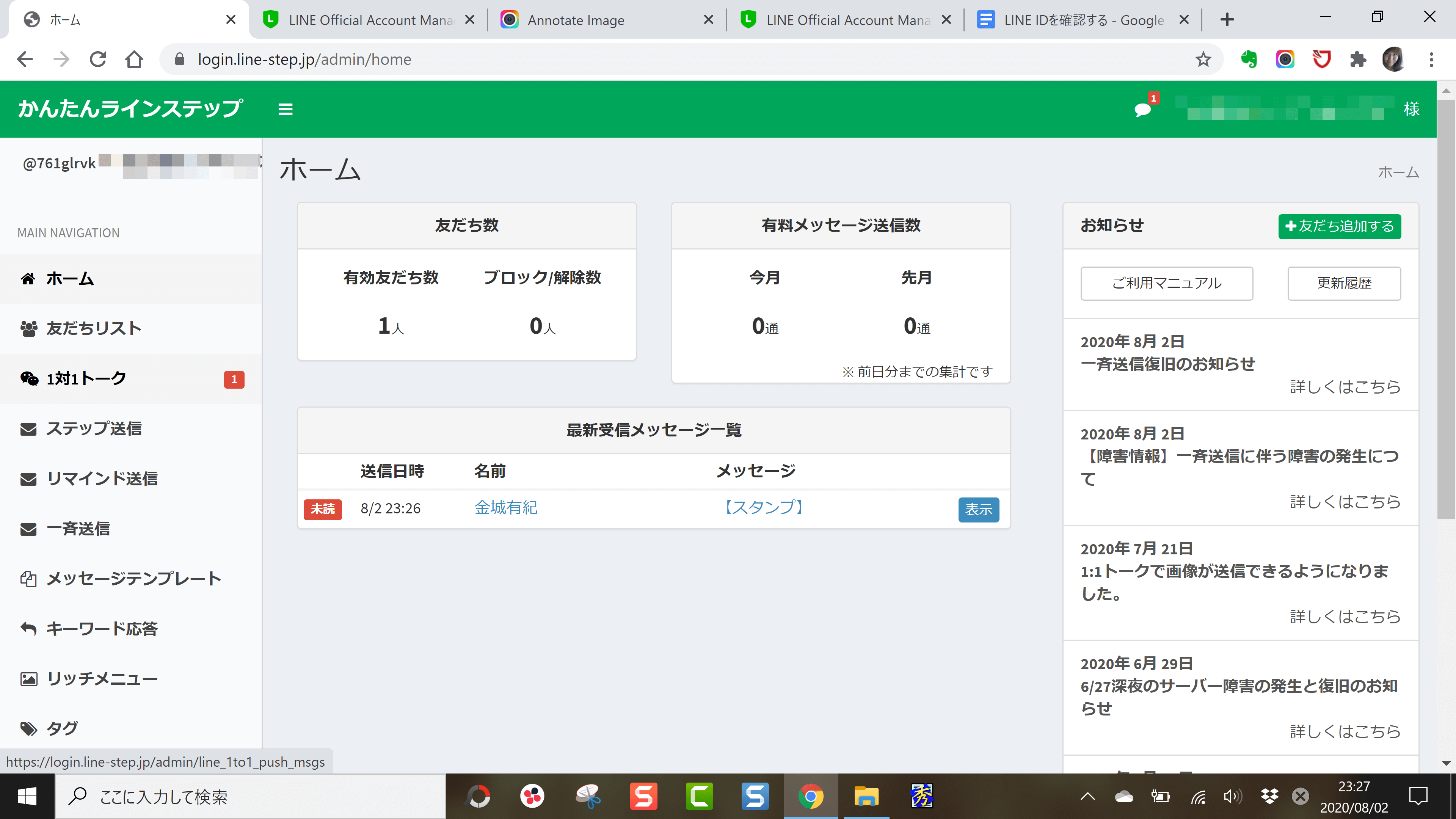 パソコンから、かんたんラインステップの管理画面にアクセスしてください。そちらで、個別のメッセージの確認や、やりとりができます。
