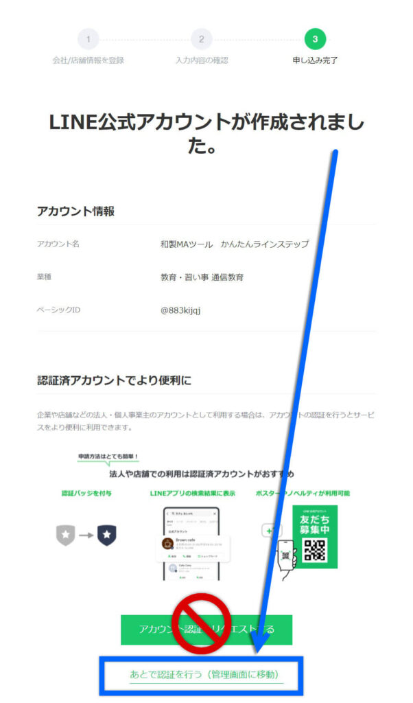 ここでアカウント認証リクエストして、即座にLINE公式アカウントが削除された事例がありますので、ご注意ください。