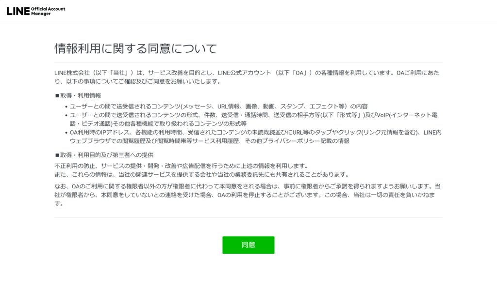 新規追加したばかりのLINE公式アカウントの場合、規約への同意文章が表示されますので、同意ボタンを押してください。